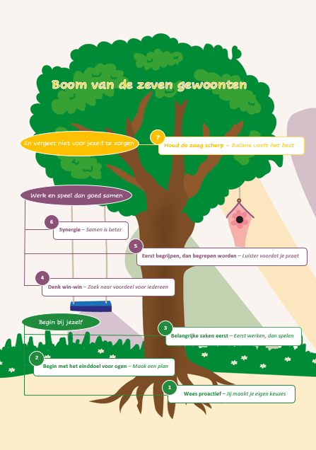 We vinden het belangrijk dat kinderen hun zelfstandigheid en verantwoordelijkheidsgevoel ontwikkelen. Om die reden leren de kinderen de '7 gewoonten van persoonlijk leiderschap'. Deze universele gewoonten dragen bij aan een zekere grondhouding; De goede dingen doen om succesvol te zijn voor jezelf maar ook succesvol in de samenwerking met anderen. De goede dingen doen, niet omdat de leerkracht controleert, maar door motivatie vanuit het kind zelf.